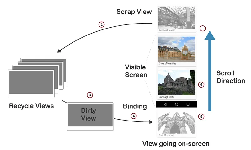 리사이클러뷰는 스크롤을 할 때 캐시에 뷰(Scrap View)를 저장하고 캐시가 가득 차면 바인드 되어야 하는 Dirty 뷰로 뷰풀에 저장됩니다.